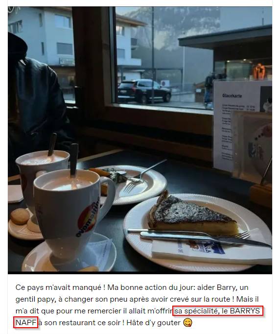 Nous savons qu’elle est dans un endroit qui sert une spécialité, le “Barry’s Napf”, je vais donc chercher ce lieu sur google.
