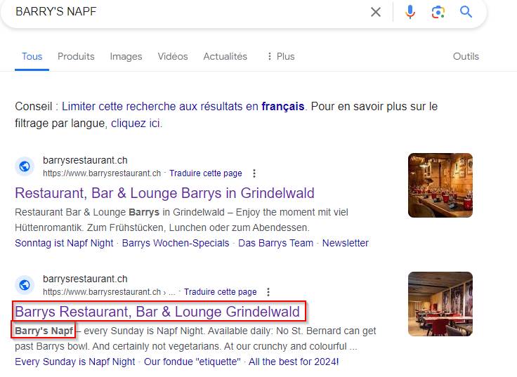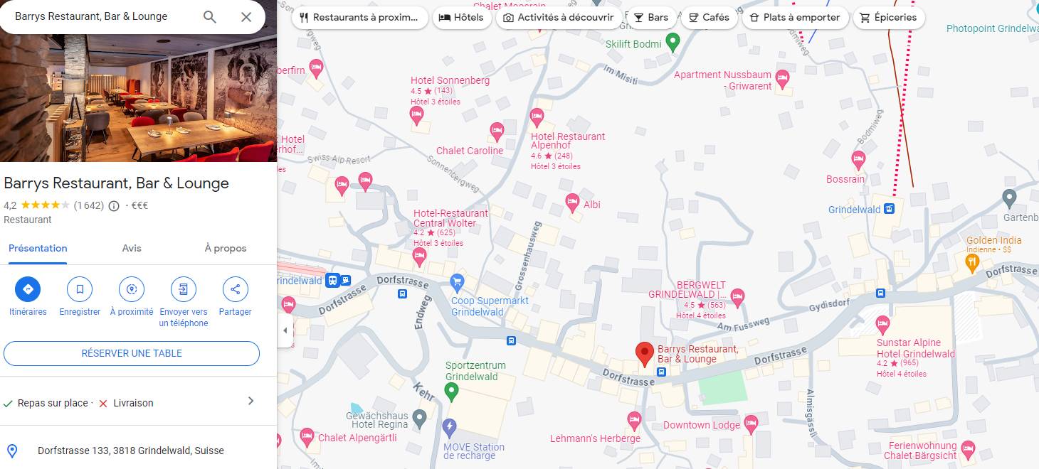 Via la recherche que nous avons pu effectuer, nous avons une correspondance dans les deux premiers résultats. Je vais donc chercher l’adresse de ce restaurant sur Grindelwald.