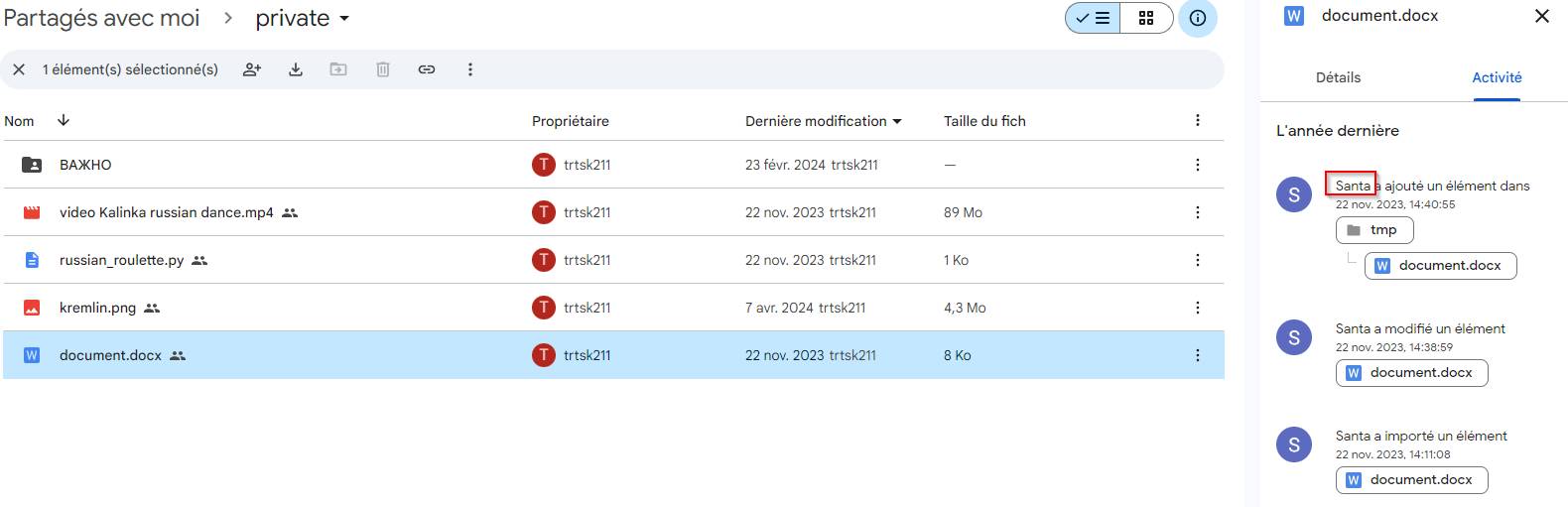 Maintenant, nous devons trouver un autre pseudo grace aux informations sur le drive. En fouillant, je regarde les activités sur les documents et trouve un pseudo qui est: Santa. Cependant, quelque chose est louche, c’est bien trop simple.