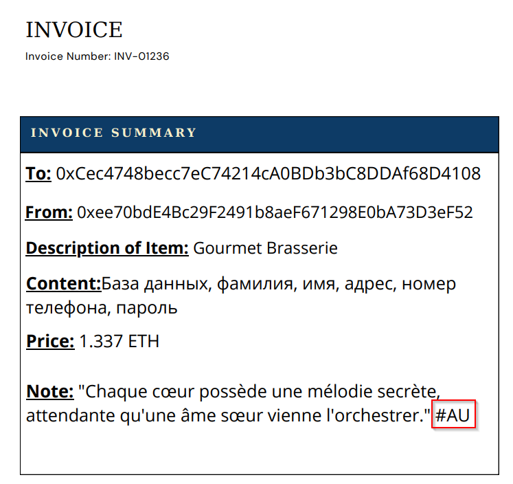 La facture est apposée d’une note avec un texte aux allures poêtiques, mais également d’un “tag” signé “#AU”.