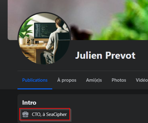 Ici, nous avons bien un résultat pertinent pour le site “sea-cipher”. Afin d’être sûr je regarde sur le profil de notre victime pour savoir s’il a mis une information nous confirmant que ce pourrait bien être son site.