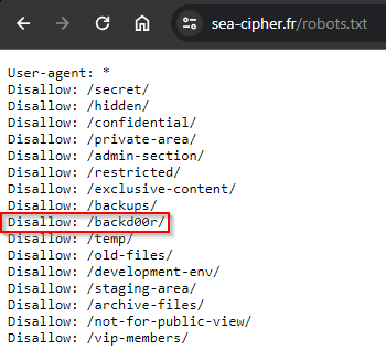 Alors en premier lieu, je me rends sur le site piraté, et je vais observer le fichier “robots.txt” accessible à tous ouvertement et qui sert à l’indexation des pages sur les moteurs de recherche.