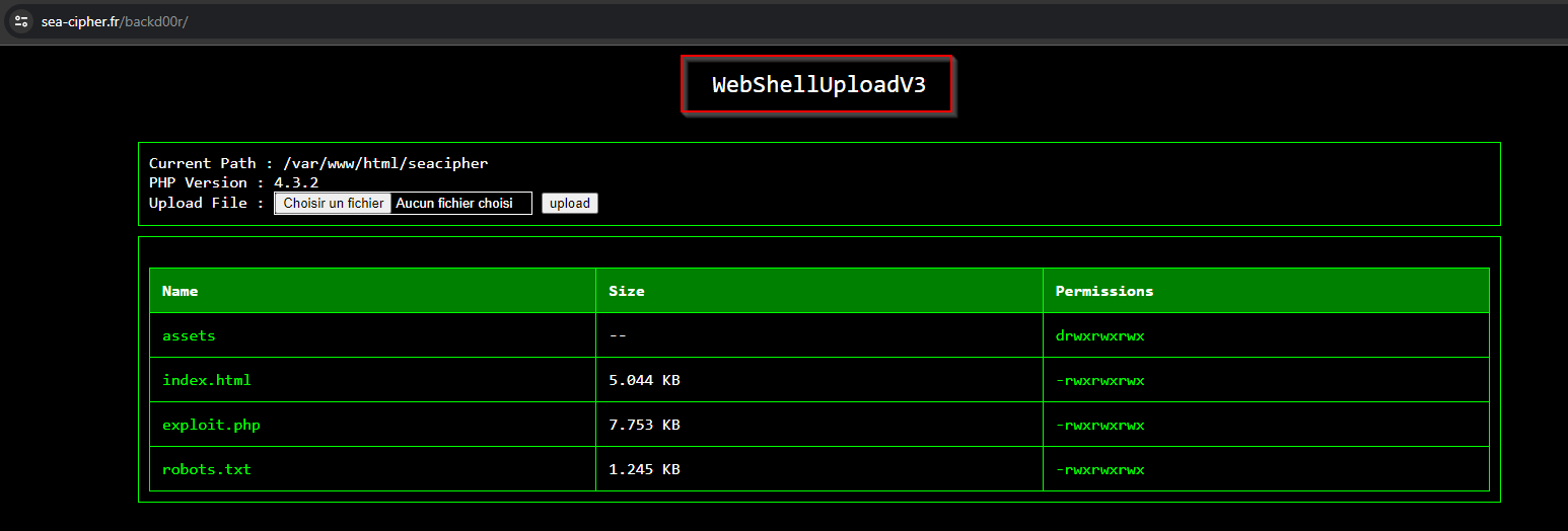 Il y a une vollée de dossier “cachés” qui n’existent pas sur le site, mais par contre, celui qui retient mon attention est “backd00r” alors je vais voir ce qu’il y a dessus.