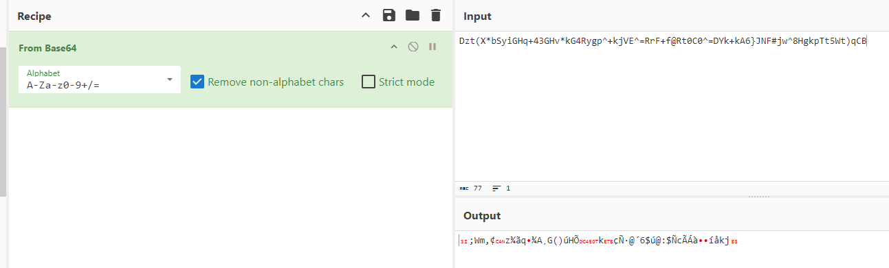 Mais… S’il s’agissait simplement d’un encodage? Alors je vais sur Cyberchef de nouveau et tente le base64 qui ne marchera clairement pas car il y a des caractères spéciaux et donc ne correspondent pas.