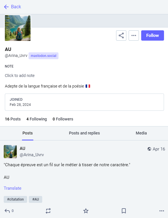 Maintenant que nous avons le Mastodon de notre financière, au lieu de m’éparpiller, je vais donc inpecter le profil du réseau social.
