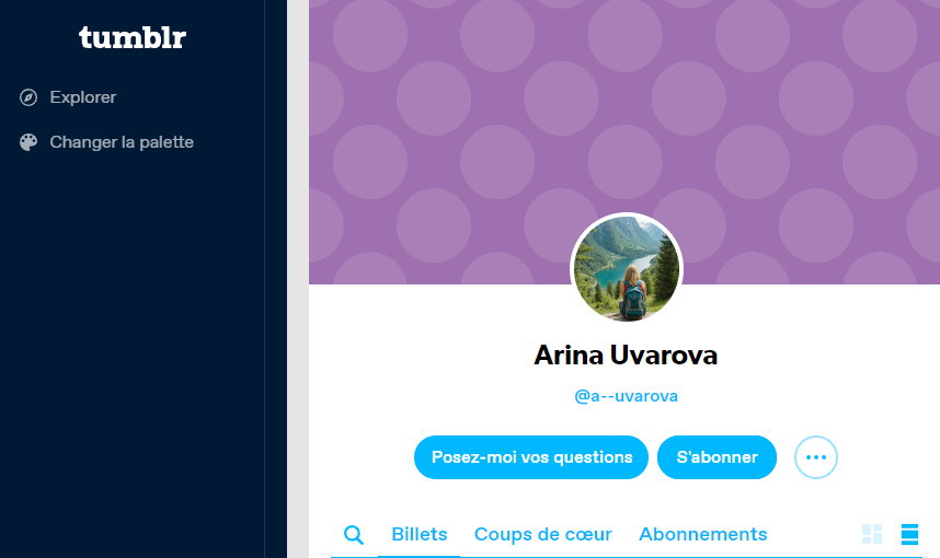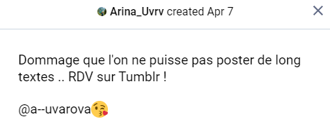 Nous pouvons donc observer qu’elle aime bien la poésie et la langue française mais aussi nous pouvons supposer qu’elle utilise son prénom “Arina” et un diminutif de nom de famille “Uvrv”.