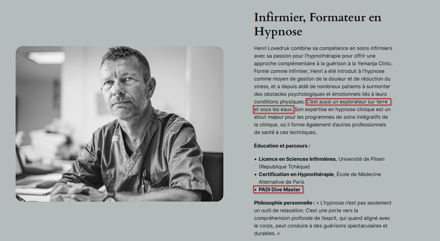 Ici, deux infos très intéressantes. Il aime faire de l’exploration terrestre et sous marine, mais je vois également qu’il est ‘Padi’ ce qui signifie : “Professional Association of Diving Instructors”.