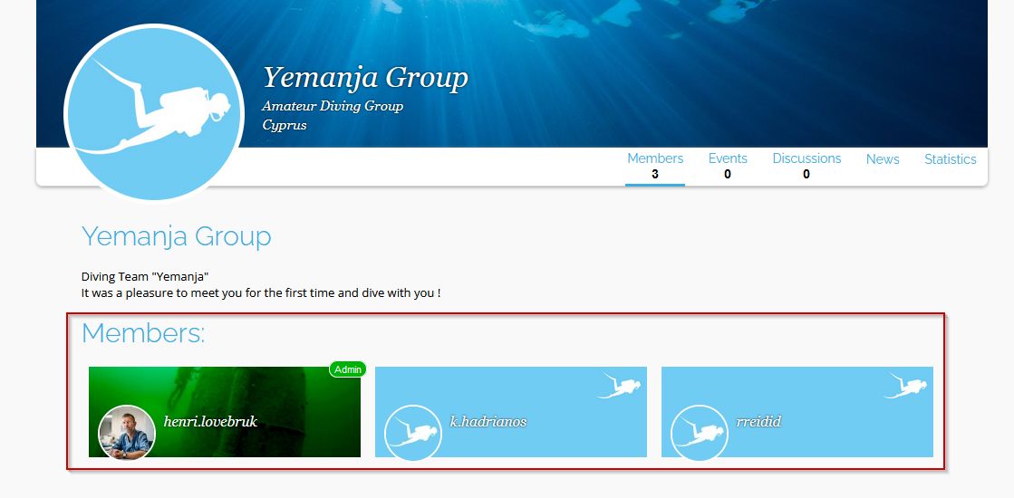 Parfait, c’est bien lui. Il a un groupe, 5 plongées notées et 2 photos. Je vais observer le groupe pour commencer.