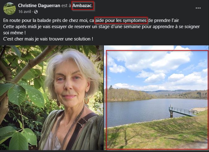 Elle aime se promener parfois pour estomper ses symptomes. A quelle adresse a t-elle pris une photo près de chez elle ? Format de flag :