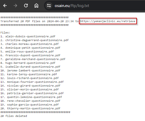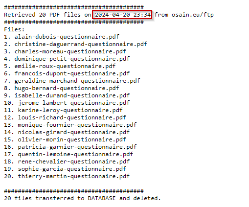 A quelle date et heure des fichiers ont-ils été transmis pour la dernière fois à la clinique par Osaïn ?