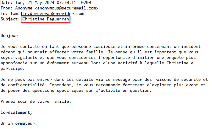 Nous commençons notre enquête. Premièrement j’observe le mail que la famille inquiète nous a fourni.