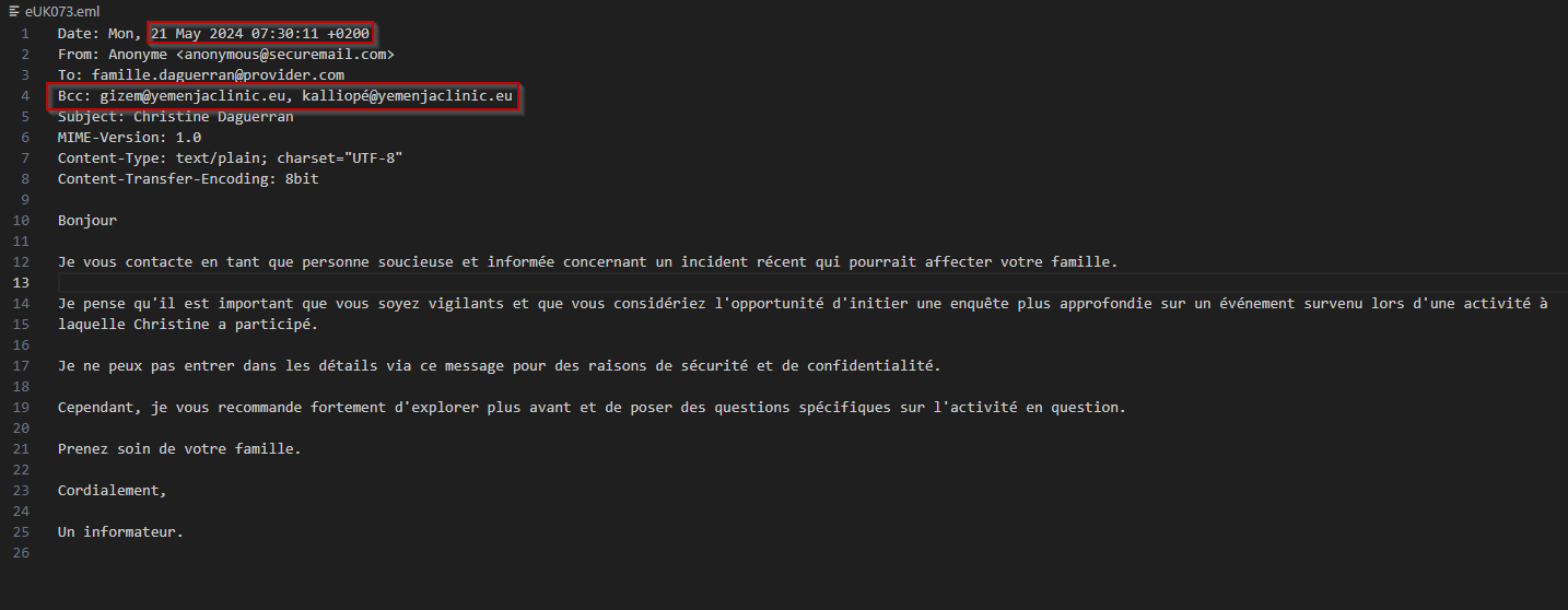 Je retrouve bien le mail anonyme, mais deux infos en plus. Je sais que ça a été envoyé le 21 mai, et qu’il y a eu Kalliopée et Gizem en copie.
