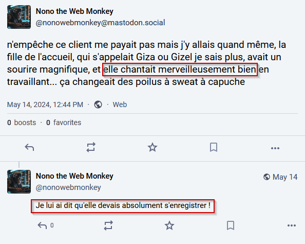 Il indique qu’elle chante très bien et qu’il faut qu’elle s’enregistre… Je connais un site super ou les amateurs peuvent mettre leurs enregistrement.