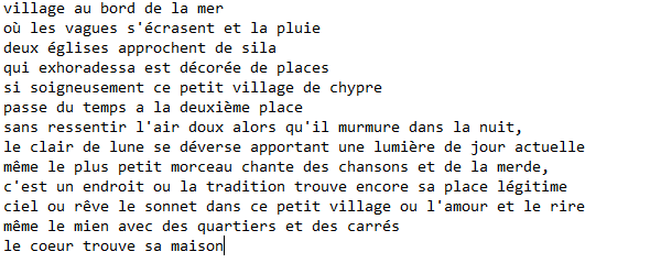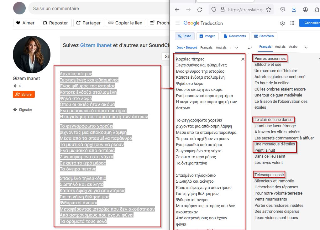 Sur sa première musique, nous avons un texte affiché, elle parle de pierre anciennes, de clair de lune, de tapis d’étoile la nuit.