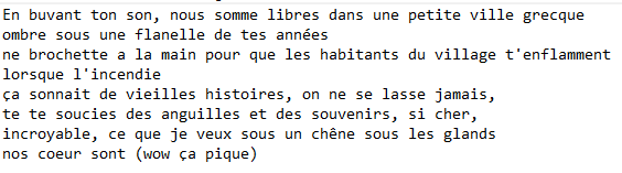 Sur toutes les autres musiques, pas de paroles données… Alors je sort mon arme secrète… Google trad en traduction vocale.