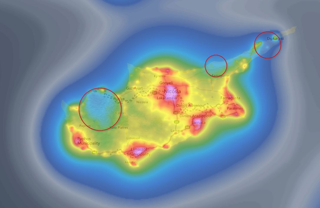 Sur cette carte, on a trois zone a faible pollution lumineuse, toutes trois près de la côte.