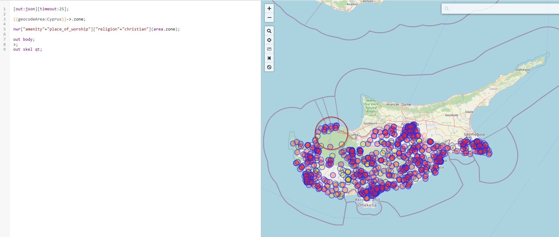 Maintenant je vais faire une requête overpass pour chercher toutes les églises dans Chypre.